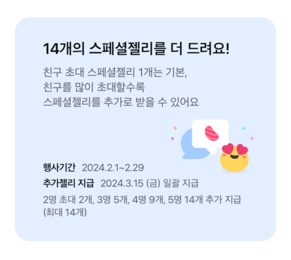 친구를 초대하면 초대할수록 지급되는 스페셜젤리의 개수가 늘어나는데요, 스페셜 젤리는 현금화할때 하나에 최소 1,000원이므로 도전해볼만 합니다.