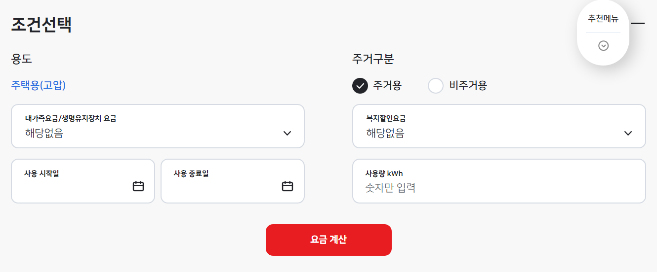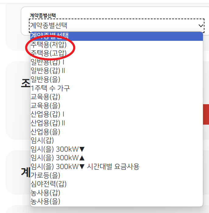 가정용 전기요금 조회시에는 주택용 (저압) or (고압) 중에 선택해주시면 됩니다.