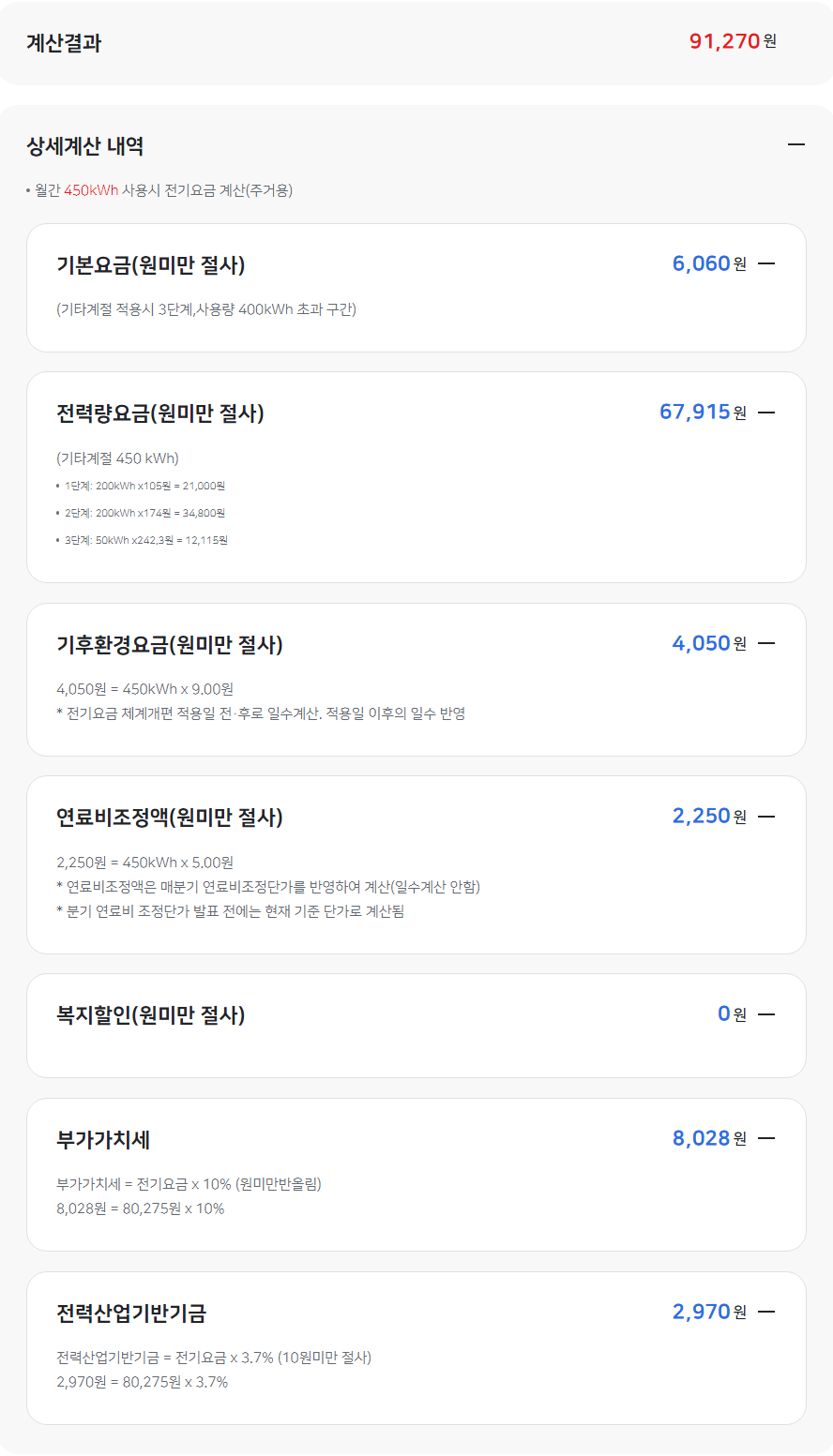 그러면 이렇게 전기요금을 조회해줍니다. 어느 부분에서 요금이 부과되었는지 친절한 설명도 함께 제공해줍니다.