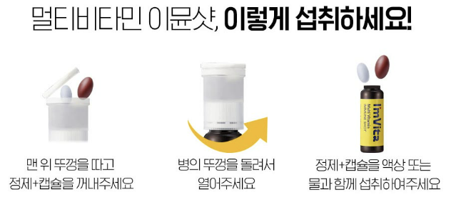 아임비타 이뮨샷은 기존의 약들과는 달리 조금 신기하게 생겼는데요, 한 번 먹을때 저렇게 하나의 병을 모두 섭취해주시면 됩니다. 뚜껑쪽에는 정제와 캡슐이 들어있고 밑의 통에는 액상이 들어있는 구조에요. 액상은 특성상 몸에 흡수가 더 빨리 됩니다.