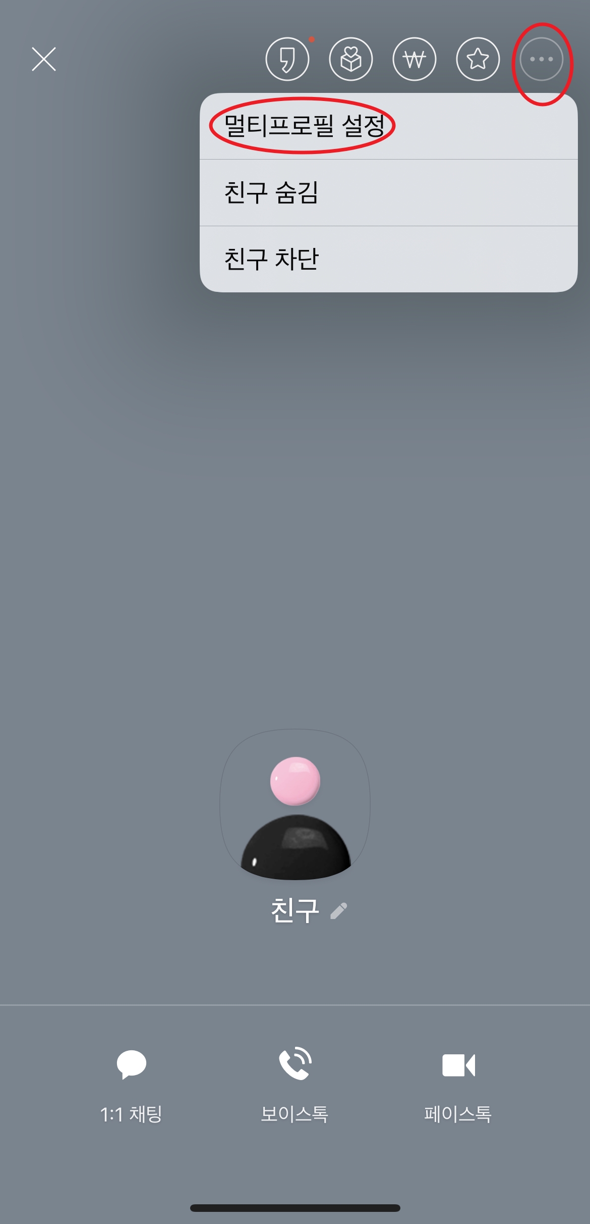 이렇게 친구 프로필에 들어가주세요. 우측 상단의 점 세개를 클릭하면 멀티프로필 설정이라는 창이 있는데요,
