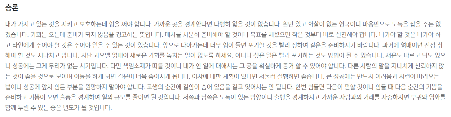 밑으로 내려보면 재물운, 직장/사업운, 가정/건강운, 이성 대인관계 등등의 운을 상세하게 알려줍니다.