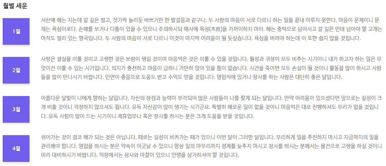 특히 이렇게 월별로 운세를 알려주는 것이 좋습니다. 2024년 월별의 운세를 받아볼 수 있습니다.