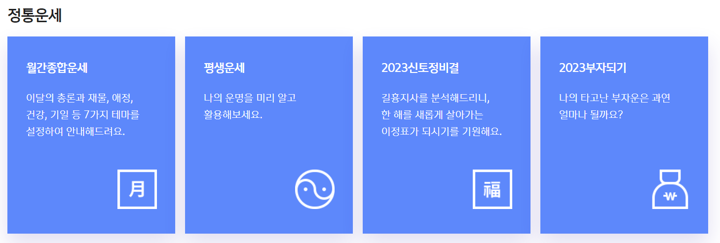 사진에서 보이는 정통운세를 비롯한 생활운세, 애정/궁합 운세 등의 카테고리가 있고 그 속에서도 정말 세부적으로 항목이 나뉩니다.