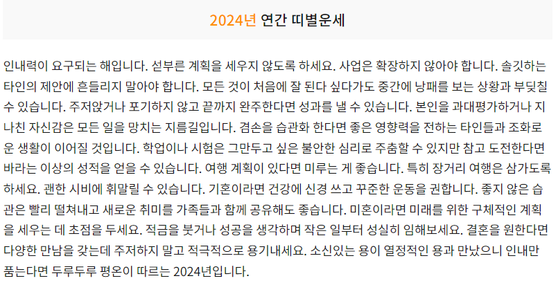 이런 식으로 2024년 한 해의 운세를 정리해주는데요,
