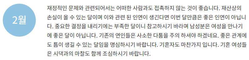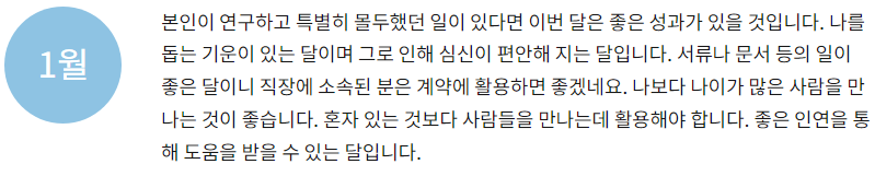- 재물운 - 재물운에서는 매우 좋은 운이 따릅니다. 고정비와는 별도로 큰 노력 없이 추가적인 수익이 발생하게 됩니다. 이때 많은 욕심을 부리지 않고 만족하는 태도가 중요하겠습니다.