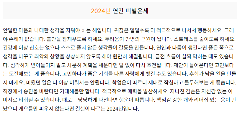 | 2024년 무료 띠별 운세 모음 [바로 확인하기] [쥐띠 소띠 범띠 토끼띠 용띠 뱀띠 말띠 양띠 원숭이띠 닭띠 개띠 돼지띠] (0) | 2023.12.06 |