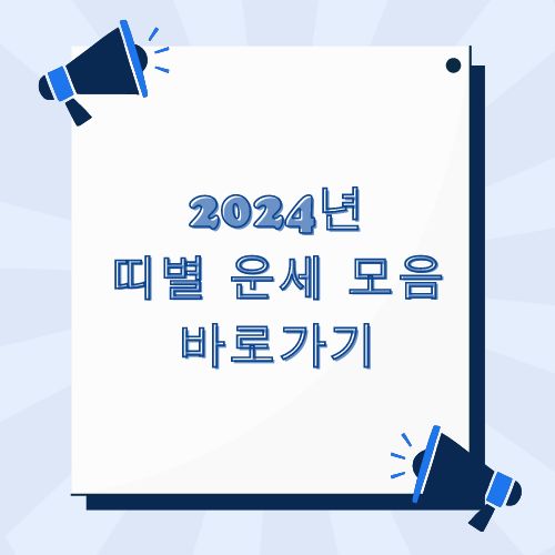 2024년 새롭게 갑진년을 맞아 띠별 운세를 궁금해하시는 분들이 많으신것같습니다. 띠별 운세에 대해 알아보는 시간을 가지도록 하겠습니다. 각자 자신의 운세를 확인해보시고 새롭게 계획을 잡으시는데 도움이 되셨으면 좋겠습니다.