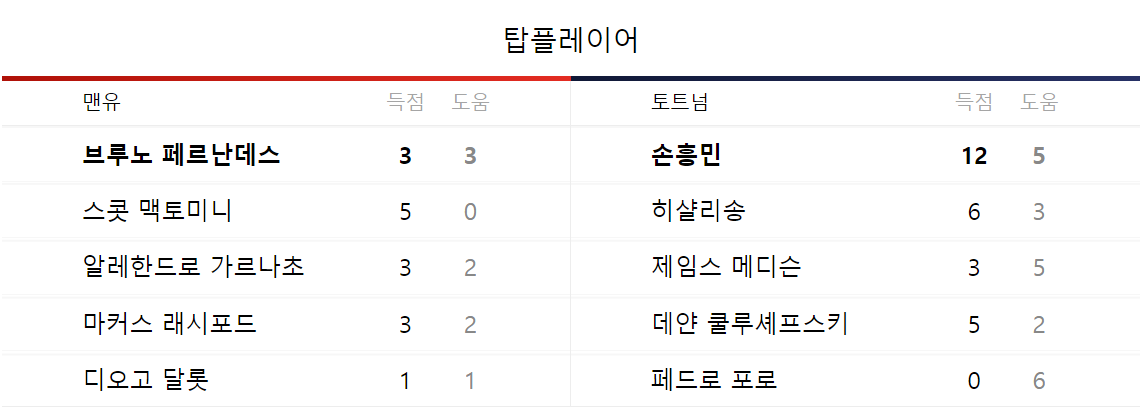 토트넘 역시 손흥민선수를 비롯한 좋은 실력을 가진 선수들이 있습니다. 탑플레이어는 공격 포인트가 많은 선수들을 기준으로 선발하는데요, 이렇게 분석된 것을 보니 손흥민 선수의 경기력이 얼마나 대단한지 가늠이 되는것같습니다.