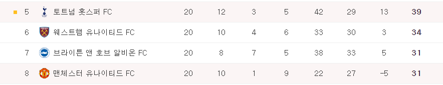 가장 우측에 보이는 점수가 바로 승점인데요, 토트넘은 39점이며 맨유는 31점으로 토트넘이 8점 더 앞서고 있는 것을 확인할 수 있습니다.