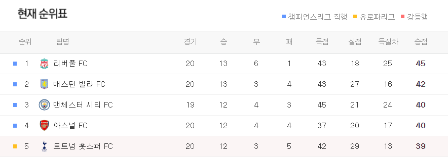 총 20R 까지 경기를 진행한 현재 상황을 보면 토트넘은 5위를 차지하고 있습니다. 아슬아슬하게 유로파리그에 든것을 볼 수 있습니다.