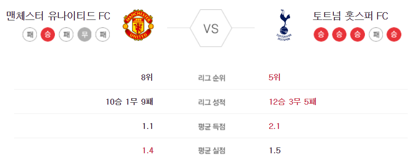 각 팀의 전력을 비교해보도록 하겠습니다. 프리미어 리그에서 지금 토트넘은 5위, 맨유는 8위의 성적을 차지하고 있습니다.