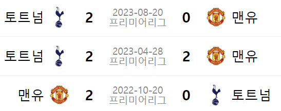 가장 최근의 경기도 맨유는 패무패승패 라는 성적을 기록한 반면, 토트넘은 한번의 패배를 제외한 나머지 네번의 경기를 모두 승리하였기 때문에 기세가 더욱 좋습니다.